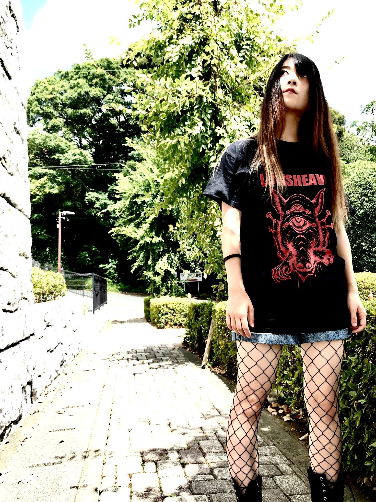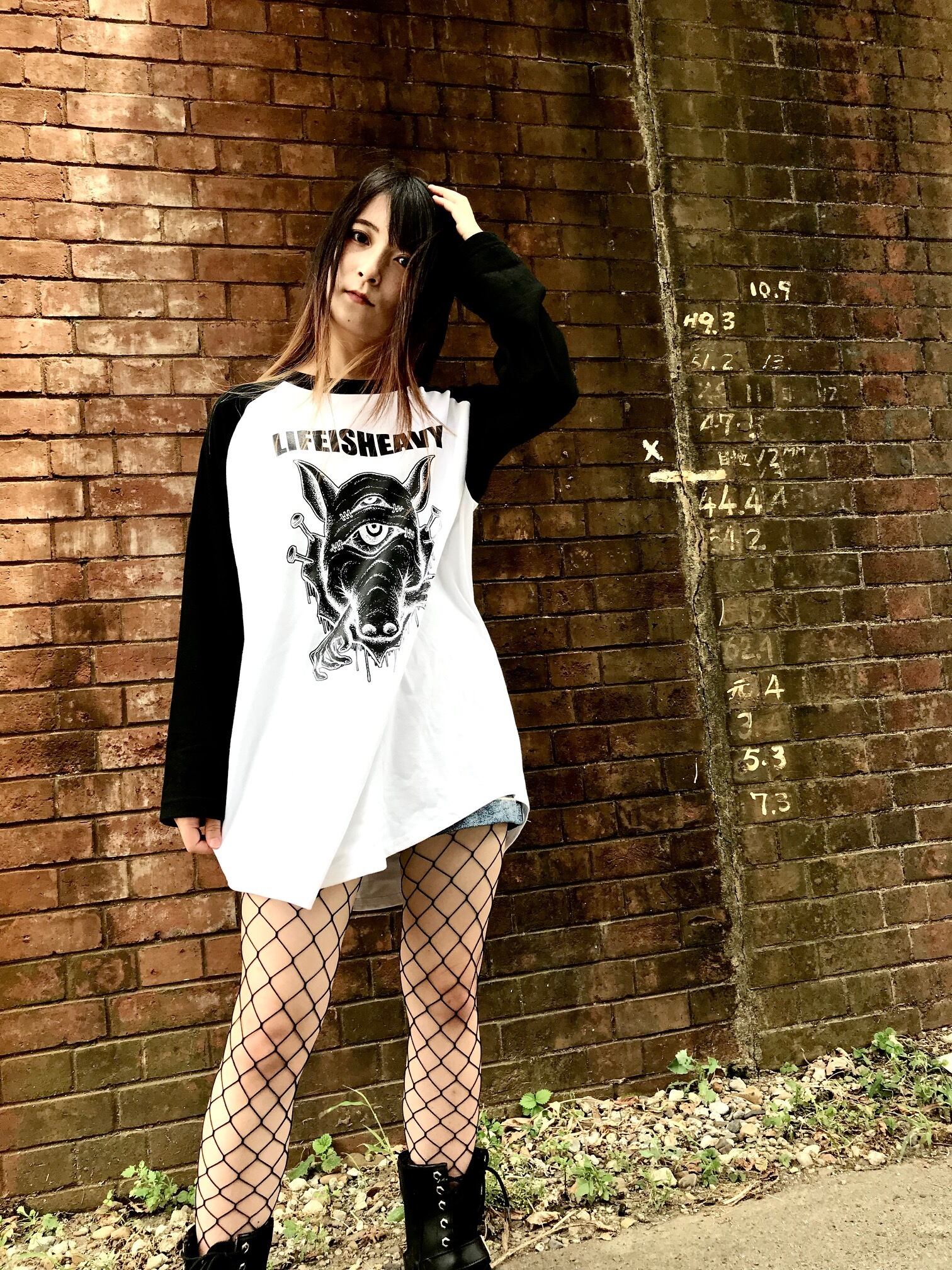 身長152cm女子、TシャツSサイズ、Lサイズ、ラグランTシャツLサイズの着用例となります。